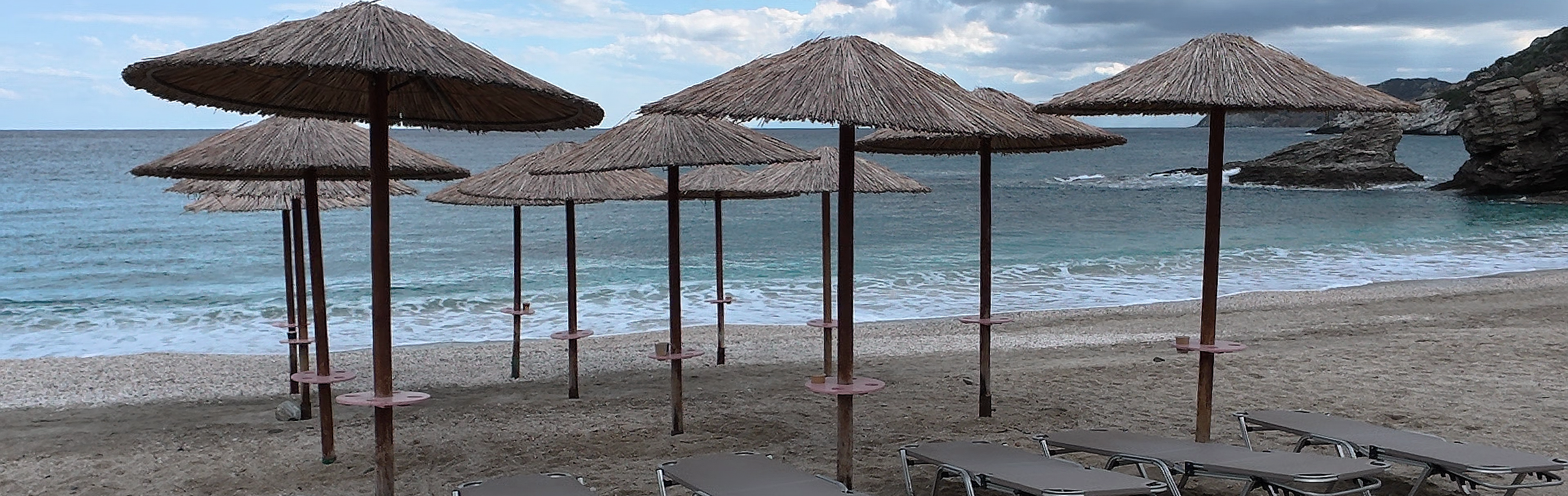 Strände wie Agia Anna oder Pefki sind breit, oft aus einer Mischung aus Sand und feinem Kies, und ziehen sich über weite Strecken entlang der Küste. Besonders Agia Anna wirkt mit seiner Weite und dem Blick nach Süden eindrucksvoll: Die Küstenlinie scheint kein Ende zu nehmen, während hinter dem Strand die Berge steil aufragen.
