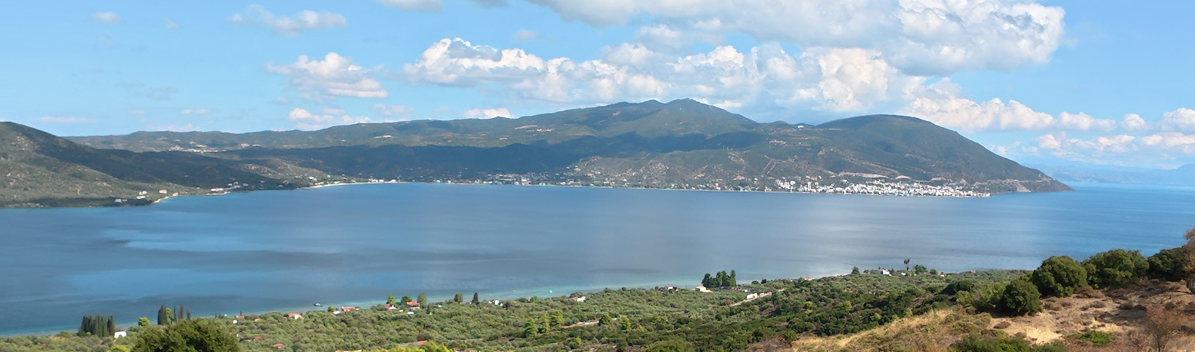 Hier spürt man, dass die Landschaft keine Übergänge braucht, um zu faszinieren: Das Telethrio-Gebirge erhebt sich dicht bewaldet, die Küstenlinie windet sich sanft, und zwischen Insel und Festland entsteht ein Meer, das zugleich Grenze und Verbindung ist.